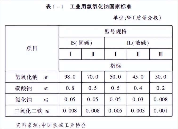 从物理形 态来看,工业烧碱执行《中华人民共和国国家标准工业用氢氧化钠》(GB/T 209 - 2018)标准(以下简称国标)。国标将工业用氢氧化钠分为两大类,国标IL为液体工业用氢氧化钠(通称液碱),国标IS为固体工业用氢氧化钠(通称固碱)。