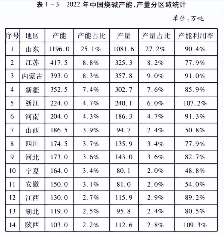 具体到企业而言,2022年中国烧碱生产企业共171家,分布于全国28个省(市、自治区)。山东、江苏和内蒙古辖区企业数量均超过10个,其中,山东省以33家烧碱企业的绝对优势占据首位。从产能集中度上来看,产能在100万吨以上的企业仅4家,企业数量占比为2.3% ,产能占比10. 0% ,行业集中度不高。企业生产情况如表1 -4所示。