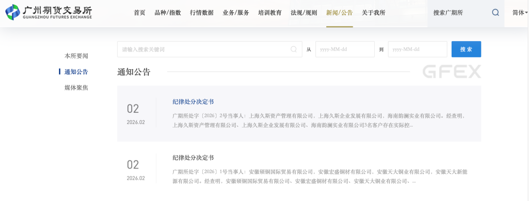 其中一份决定书显示,经查明,安徽硕铜国际贸易有限公司、安徽宏盛铜材有限公司、安徽天大铜业有限公司、安徽天大新能源有限公司4名客户存在实际控制关系,2025年12月1日至12月5日连续5个交易日合并持仓超过PS2512交割月持仓限额,违反《广州期货交易所违规违约处理办法》第二十六条第一项“利用分仓等不正当手段,规避交易所持仓限制”的规定。相关客户违规持仓行为亏损480660元。根据《广州期货交易所违规违约处理办法》第二十六条规定,交易所决定给予这4名客户公开谴责、暂停开仓交易6个月的纪律处分,并将纪律处分结果记入证券期货市场诚信档案。