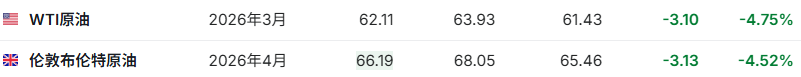 3. 截至发稿,WTI原油跌4.75%,报62.11美元/桶。布伦特原油跌4.52%,报66.19美元/桶。