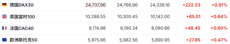 2. 截至发稿,德国DAX指数涨0.91%,英国富时100指数涨0.64%,法国CAC40指数涨0.60%,欧洲斯托克50指数涨0.47%。