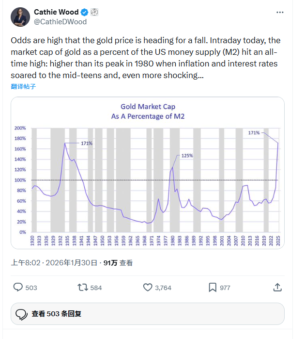 据财联社报道,1月30日,金价暴跌12%至5000美元以下,创下自20世纪80年代初以来最大单日跌幅,就在这次暴跌前几个小时,华尔街明星基金经理、方舟投资的掌门人“木头姐”凯茜 伍德(Cathie Wood)在社交媒体X上发帖暗示,金价接近峰值的可能性正在上升。她认为如今的泡沫不在人工智能领域,而是在黄金领域。另一方面,如果美元走强,黄金似乎会变得脆弱。她以1980年至2000年期间为例,指出当时美元走强的同时,黄金价格下跌了超过60%。她警告称,黄金的历史性上涨是一个投机泡沫,即将破裂。她的论证基于历史估值指标、宏观经济背景以及美元走势。