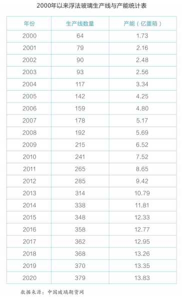 自进入工业化以来,我国平板玻璃行业总体保持扩张的态势,是全球最大的玻璃生产国。国内平板玻璃产能由2008年的5.69亿重箱增长至2020年13.83亿重箱,年均产能增速达8%。截至2020年底,全国共有浮法玻璃生产线379条,单线平均产能达到515吨/日。