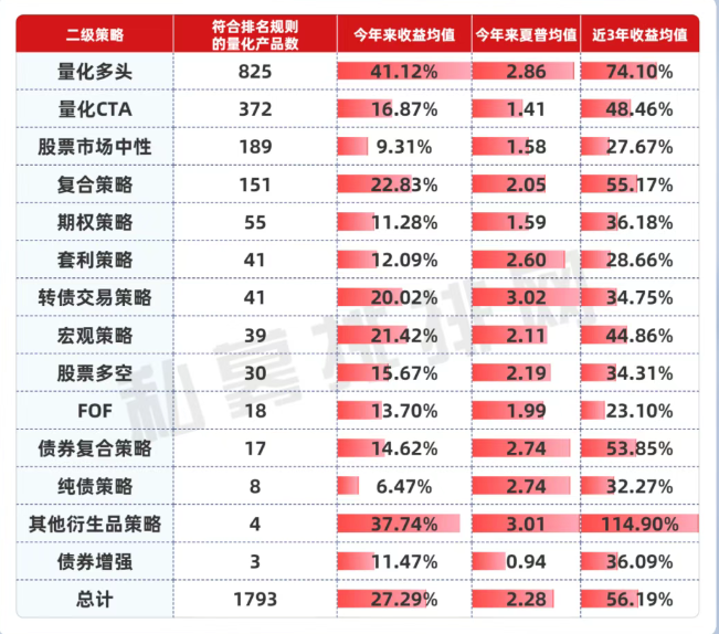 业绩方面来看,793只量化产品收益均值为27.29%,其中825只量化多头策略今年来收益均值为高达41.12%,以明显优势领先。其次是复合策略、股票多空策略。