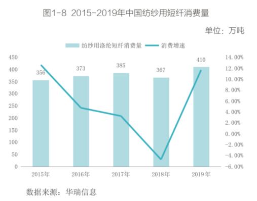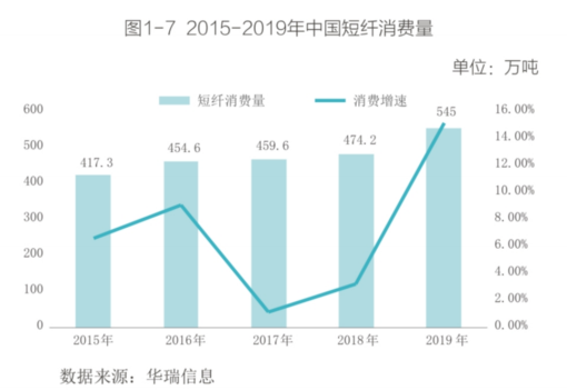 2015-2019年以来,国内短纤消费量一直保持着增长的趋势。其中,2016年国内原生短纤消费有了较快增长;2017、2018年增速重回较低水平; 2019年国内原生短纤消费量为545万吨,同比增长14.9%,消费量及增速均创近几年新高。