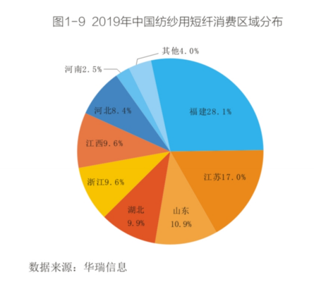 国内短纤总体以纺纱用为主( 2019年占比73%),其他用途不仅占比较少,而且企业分布相对分散,难以有效统计各地区的消费情况,因此本节仅统计纺纱用短纤消费量的区域分布。纺纱用短纤的消费与我国纺织行业的发展分布有关,主要分布在福建、江苏、山东、湖北、浙江、江西等地。福建省是目前国内最大的纯涤纱生产地,也是纺纱用短纤消费量最大的地区,消费量占全国的28.1%。江苏省作为纺织服装大省,消费量占比17%。此外,山东占10.9%、湖北9.9%、浙江9.6%、江西9.6%、河北8.4%。