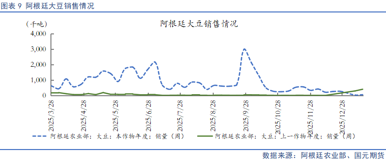 但巴西出口结构出现变化,ANEC预测2026年对华大豆出口将同比减少1000万吨至7700万吨,占比降至68.8%,较2025年80%的占比明显下滑,需拓展非中国市场消化丰产余量。整体来看,南美大豆出口受巴西丰产、阿根廷政策驱动保持高景气,虽巴西对华出口占比下滑,但非中国市场需求及旧作去库支撑出口规模。