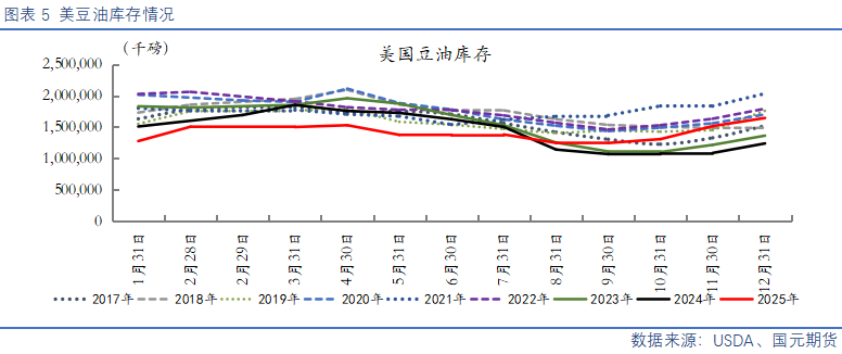 2026年1月美国大豆压榨延续强劲态势,NOPA数据显示2025年12月大豆压榨量达2.24991亿蒲式耳,环比增4.1%、同比增8.9%,创历史单月次高水平,仅次于2025年10月记录,反映美国国内压榨需求持续旺盛。USDA1月供需报告同步上调2025/26年度美豆压榨量至25.7亿蒲式耳环比上涨0.15亿蒲,归因于大豆油需求支撑与压榨利润改善。内需结构中,大豆油用于生物燃料的占比预计提升至11.2%,饲料消费保持稳定,食品加工需求小幅增长。生物能源政策方面,EPA拟于3月初敲定2026年可再生燃料标准(RFS)配额,当前提案设定生物质基柴油目标为56.1亿加仑(较2025年33.5亿加仑激增67.5%),同时计划减少进口生物燃料生成的RINs数量,强化对国产大豆油等原料的需求依赖。生物能源目标虽为长期利好,但短期政策不确定性与巴西大豆上市压力交织。