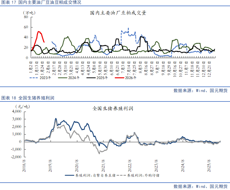 需求端迎来春节前集中备货高峰,中下游饲料企业提货积极性显著提升,1月中旬豆粕日均提货环比增加,部分油厂出现限量提货现象。需求结构以生猪养殖为主导,虽生猪养殖盈利不佳导致存栏小幅回落,但节前补栏与增重需求支撑刚性消费;家禽养殖保持稳定,水产养殖进入淡季,整体需求韧性较强。饲料厂豆粕库存天数创年内新高,备货周期延长至春节后2-3周。