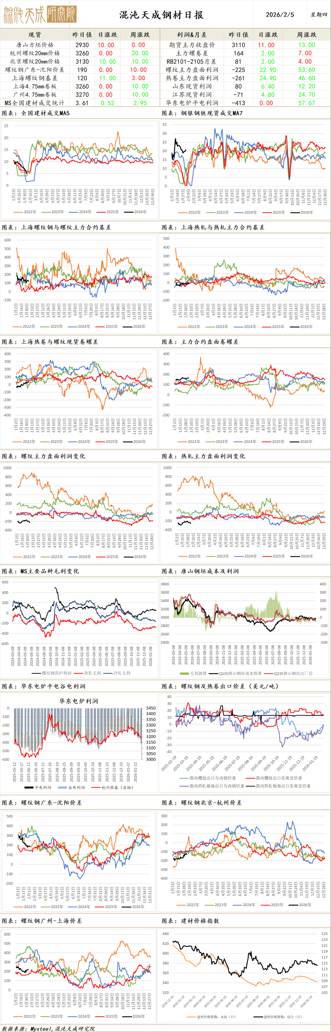 需求端,周一钢银城市钢材库存增幅加大,螺纹和热卷库存均有明显增长。昨日找钢数据显示钢材厂库、社库均有上升,总库存增幅加大,钢材表需多有回落。另据百年建筑调研,本周全国水泥出库量208.35万吨,环比下降8.5%,基建水泥直供量环比下降5.3%;混凝土发运量为115.04万方,环比减少6.8%,建筑下游需求继续走弱。海外方面,尽管ISM最新数据显示美国制造业重返扩张区间,但昨日ADP就业人数仅增加2.2万人,低于市场预期,外盘商品普遍表现回落。国内方面,周一商务部等9部门印发《2026“乐购新春”春节特别活动方案》,鼓励各地增加春节消费品以旧换新补贴数量,显示国内政策环境依然稳中向好。进出口方面,昨日美国、东南亚、南美洲钢价均有不同程度上涨,国外其它地区钢价依然持稳,近期国内外冷热卷价差部分收窄,但国内钢材仍有一定出口空间。