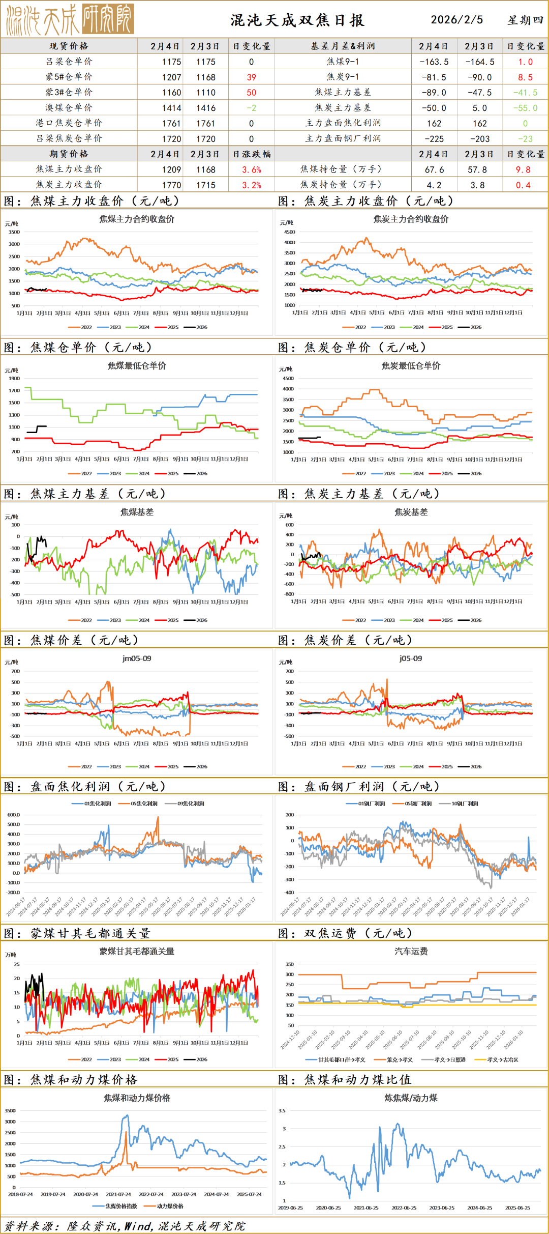 2.中国煤炭资源网冶金部2月4日重点关注:焦炭方面,临近年关,部分焦企原料库存已补至合理水平,焦煤交投氛围有所转弱,叠加焦炭首轮提涨完成,焦企利润有所恢复,开工相对稳定。需求端,终端需求不断减弱下,钢材成交量收缩加剧,库存继续累积,成材价格震荡下行,铁水产量受到压制,焦炭刚需受限,钢厂多保持按需采购。整体来看,焦炭市场矛盾不大,市场暂时维持稳定运行,后期需关注铁水产量及钢材价格走势。焦煤方面,山西地区个别煤矿已停产放假,多数煤矿正常生产中,民营煤矿放假时间集中于腊月二十三及以后,供应端逐步收紧。需求端,本周少数低库存焦企适当提库,带动部分资源降价后成交有所好转,多数补库已接近尾声,以按需采购为主,整体市场交投氛围较为清淡。不过随着供应端同步收紧,年前煤价预计偏稳窄幅调整。进口蒙煤方面,甘其毛都口岸通关再度恢复至高位,昨日通关1483车。目前贸易商报价暂稳为主,但下游采购情绪低迷,口岸成交依旧冷清,蒙5原煤价格在1030-1040元/吨左右。