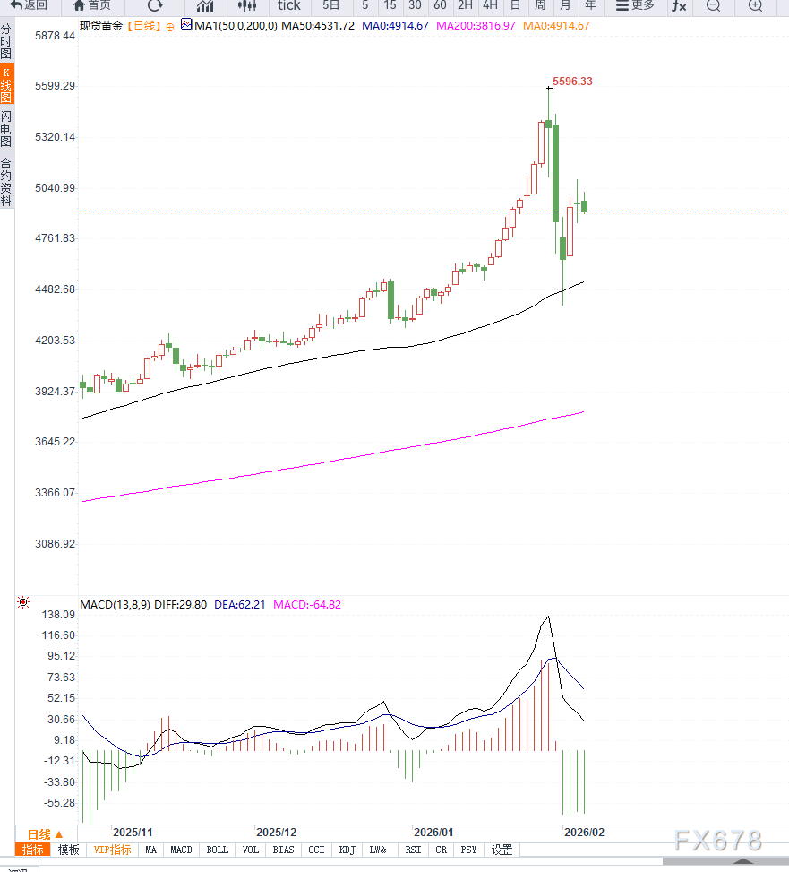 从日线形态来看,黄金在经历快速拉升与急跌后,整体走势进入高波动震荡阶段。价格在前期大幅回调后迅速获得支撑并反弹,显示多头资金并未因短期剧烈波动而全面撤离,市场结构仍保持偏强特征。