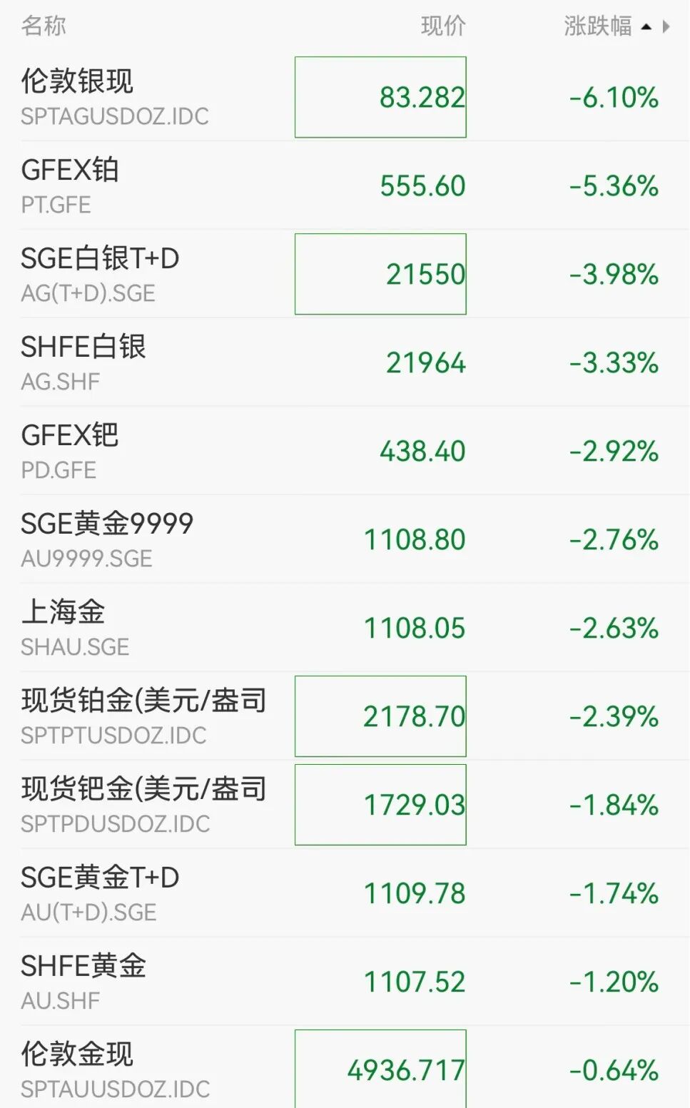 A股方面,贵金属板块开盘跌幅靠前。湖南黄金、湖南白银一度录得10cm跌停。晓程科技跌超10%,四川黄金跌超9%,招金黄金、西部黄金等纷纷下跌。