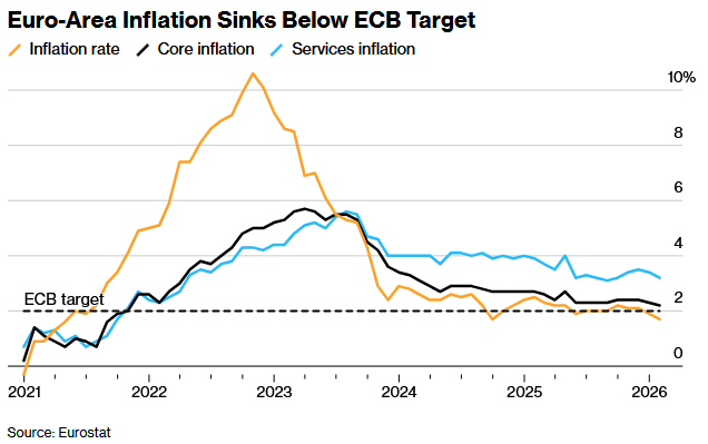 自上次欧洲央行政策会议以来,欧元区通胀率已降至欧洲央行目标以下,1月份通胀率降至1.7%。尽管基础物价增长仍较为顽固,但上个月略有缓解,服务价格涨幅也小幅放缓。经济也显示出韧性,2025年第四季度增长了0.3%——高于欧洲央行的预期。自那以来,商业调查显示经济继续温和增长。