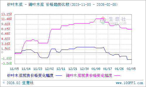 据生意社商品行情分析系统监测:本周针叶浆和阔叶浆价格均呈现小幅下行走势。2026年2月5日针叶木浆山东地区市场均价为5400元/吨,与2月2日均价相比下降了1.22%。2月5日阔叶木浆山东地区市场均价为4600元/吨,与2月2日均价相比下降了0.36%。