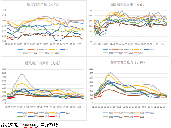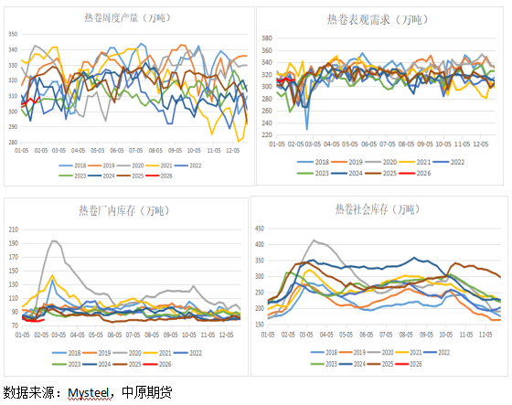 从当前整体钢材供需来看,五大材库存连续两周回升,累库集中在建材。螺纹钢周度产增需减,总库存增幅继续扩大,且主要集中在社会库存的增加。反映终端需求随着春节假期的临近持续转弱,给基本面带来一定压力。其中,螺纹钢总库存519.57万吨,环比增加9.26%,同比回落26.34%。钢厂库存153.65万吨,环比增加3.03%,同比下降30.16%。社会库存365.96万吨,环比回升12.12%,同比下降24.6%。从农历同比数据来看,库存绝对量均高于去年,但仍处于历史同期低位。