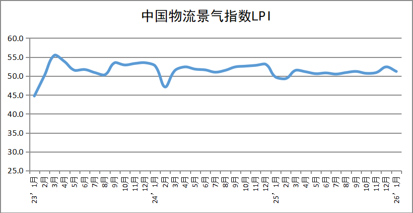 中国物流与采购联合会于2月5日发布的数据显示,2026年1月份中国物流业景气指数为51.2%,较上月回落1.2个百分点。