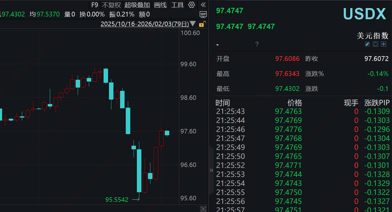 2026年1月30日,国际黄金价格创历史新高后大幅跳水,伦敦现货黄金当日收跌9.25%,盘中最大跌幅近13%,最低下探4670.36美元/盎司。而此前1月内金价累计涨幅超28%,1月29日刚触及历史高点,此次暴跌成为近期全球金融市场核心波动事件。2月2日,伦敦金现继续下跌-4.52%,最低价格触及4402.06美元/盎司。美元指数连续两日反弹至97.47,站稳97关口关键支撑位,短线多头动能持续修复。此次反弹核心源于美联储政策预期重定价,新主席人选提名后,市场对激进降息的押注降温,使得美元指数反弹。