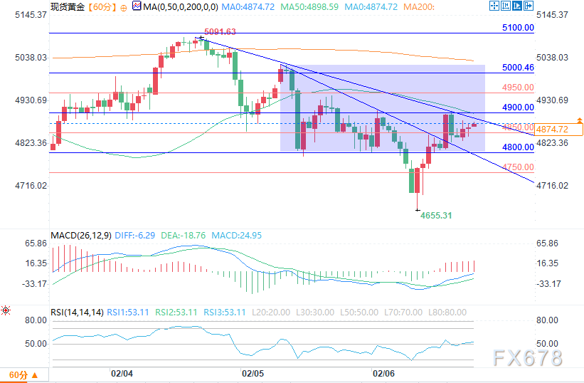黄金反弹企稳4800美元关口,短期形成下降三角形形态