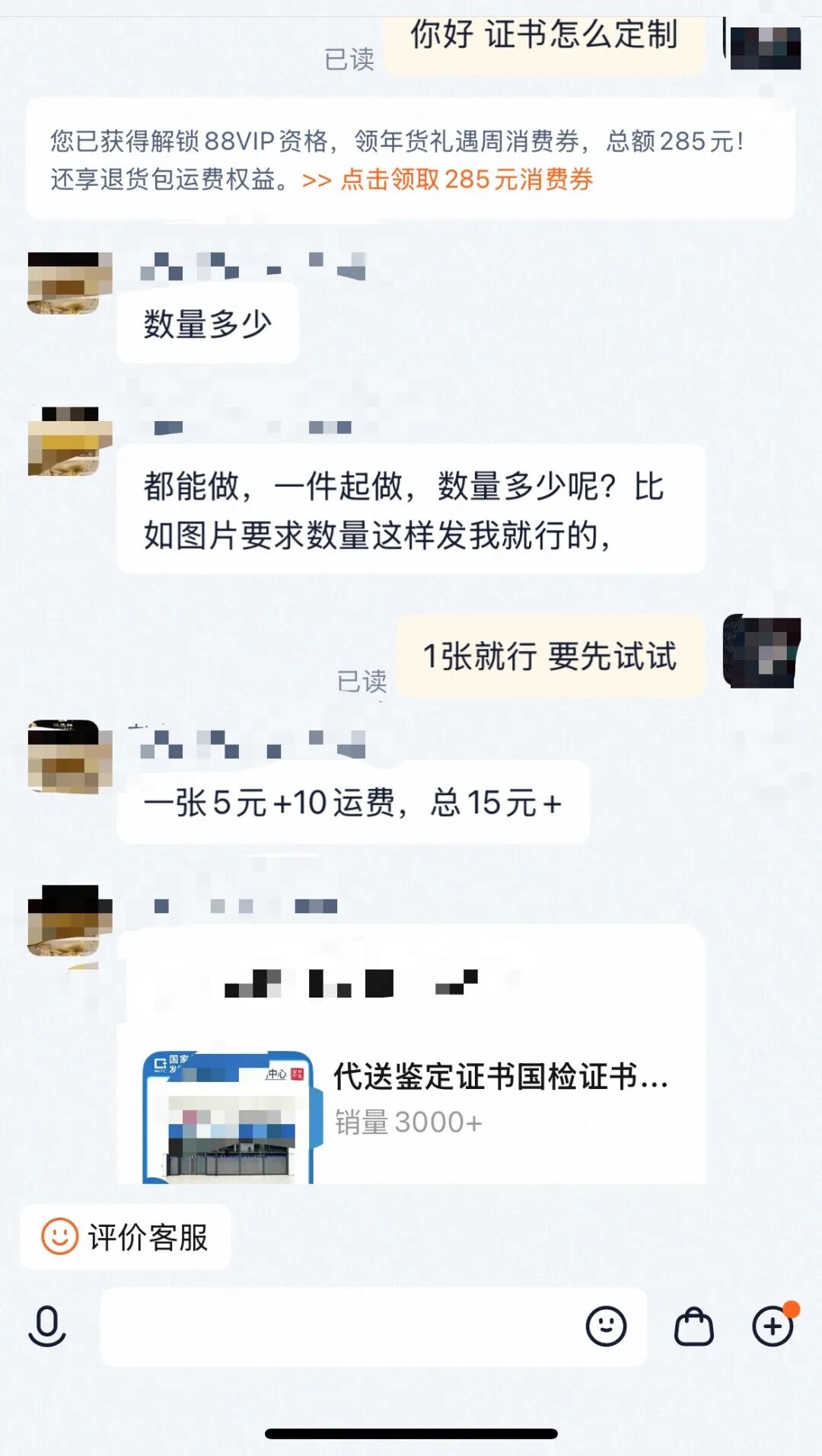 记者在某电商平台搜索“贵金属检测证书”“珠宝鉴定证书”等关键词,多家商户公开售卖所谓“定制检测证书”。记者以买家身份咨询其中一名商家,对方直言:“贵金属、珠宝都能出证,5元一份,快递10元,不用寄样品。”