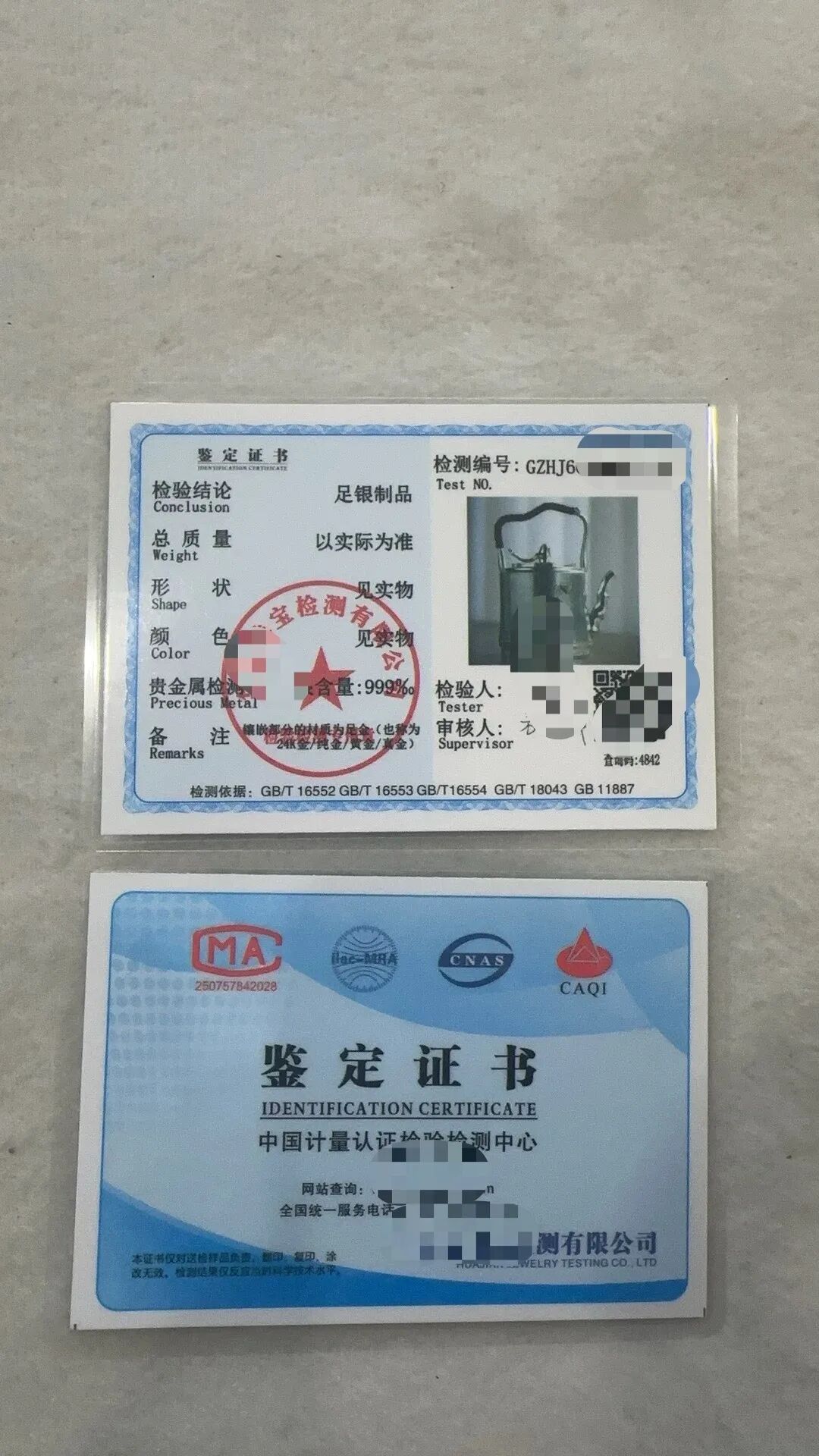 从外观上看,这类证书印刷精细,印有多枚看似“权威”的标识,包括CMA、CNAS、ilac-MRA、CAQI等,检测机构标注为“某珠宝检测有限公司”,并列明多项国家标准编号。