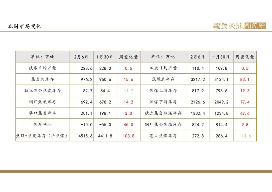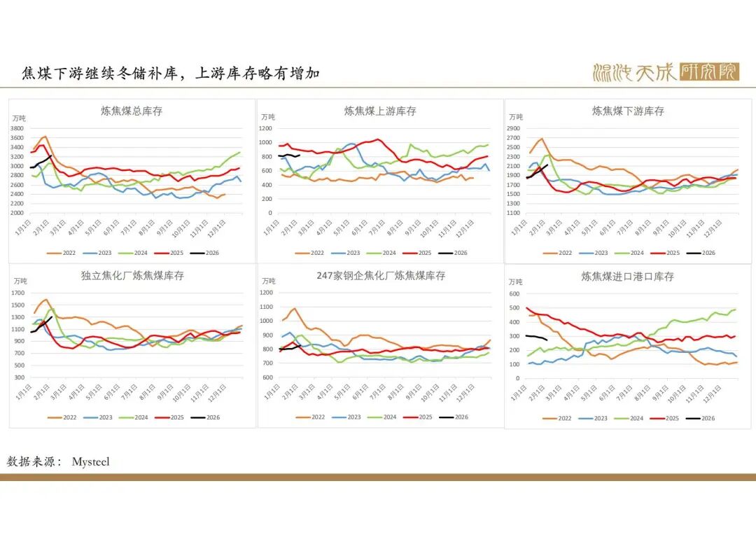 本周焦煤总库存3217万吨,环比2.7%,同比8.3%,焦煤产量回落,下游继续冬储补库,上游库存反而增加,整体库存继续回升。焦炭总库存976万吨,环比1.6%,同比-5.1%,下游继续缓慢补库,上游库存略有下降,总库存继续增加,处于较低位。