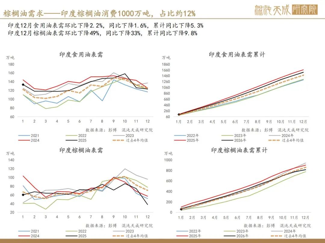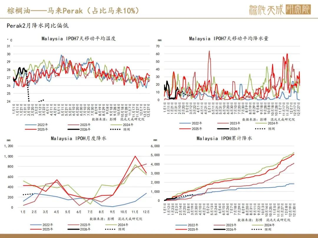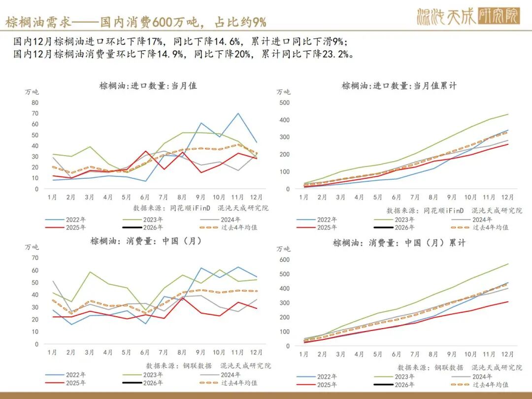 供给端:MPOA数据显示,马来西亚1月毛棕榈油产量环比下降14.03%,至157万吨;ITS数据显示,马来西亚1月1-31日棕榈油产品出口量为1463069吨,较上月同期出口的1240587吨增加17.93%;MPOB表示,2026年该国棕榈油产量预计将在1,950万至1,980万公吨之间,低于2025年创纪录的2,028万吨;印尼总统普拉博沃计划禁止棕榈油废料(含废弃食用油)出口,以优先支持国内生物柴油和航空燃料生产,减少能源进口依赖;印度尼西亚撤销了28家企业的许可证,并表示违规行为导致了洪水灾害,这些许可证涉及林业、种植园和采矿特许权,覆盖面积达100万公顷(247万英亩);普拉博沃.苏比安托总统表示,印尼今年可能再征用到400万至500万公顷(1200万英亩)的棕榈油种植园,去年他的工作组接管了据称在林区非法运营的逾400万公顷土地;印尼棕榈油协会(GAPKI)估计,2025年的毛棕榈油产量将从上一年的4816万吨达到创纪录的5100万吨,2026年产量预计将进一步增长至5120万吨,增幅为0.39%;印尼种植园基金管理机构负责人Eddy Abdurrachman表示,印尼将于2026年3月1日起将毛棕榈油出口专项税税率从目前的10%上调至12.5%,精炼棕榈油产品的税率也上调2.5个百分点;据GAPKI数据显示,印尼10月棕榈油产量为435万吨,出口量为280万吨,库存为233万吨,上月同期259万吨。