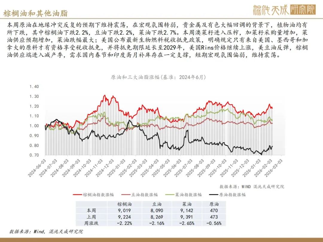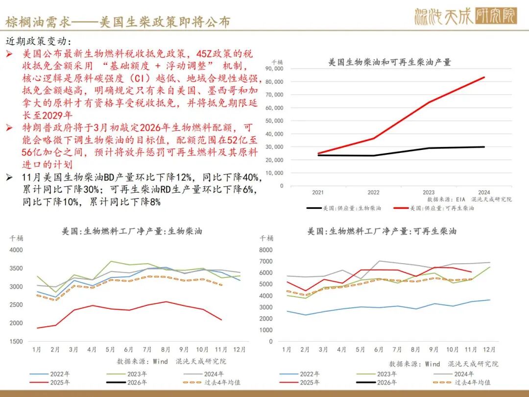 需求端:美国公布最新生物燃料税收抵免政策,45Z政策的税收抵免金额采用“基础额度+浮动调整”机制,核心逻辑是原料碳强度(CI)越低、地域合规性越强,抵免金额越高,明确规定只有来自美国、墨西哥和加拿大的原料才有资格享受税收抵免,并将抵免期限延长至2029年;印度1月份棕榈油进口量激增51%,达到四个月来的最高水平,预计2月份进口进一步增加;新的意大利生物燃料法规已获通过,该法规提高了2030年可再生燃料的强制要求标准,并撤销了对使用棕榈脂肪酸馏分原料的禁令,放宽了对使用源自废弃烹饪油的燃料的限制,并引入了10%的生物柴油混合燃料;印尼能源部副部长Yuliot Tanjung表示,印尼已取消今年将生物柴油强制掺混比例提升至50%的计划(即B50计划),维持现行40%;总统普拉博沃.苏比安托指示生物柴油政策应维持在B40水平,同时继续研究并为B50做准备,一位高级官员表示,印度尼西亚启动B50的时间,将取决于原油与毛棕榈油之间的价差;印尼生物柴油生产商组织APROBI的秘书长Ernest Gunawan表示,印尼2026年生物燃料产量配额设定在1,564.6万千升,印尼2025年生物燃料配额为1.560万公升;德国立法将禁止使用以棕榈副产品为原料的生物燃料的禁令推迟至2027年实施,提振棕榈油未来需求预期;欧洲议会支持将《欧盟零毁林法案》实施推迟一年;据巴西国家能源政策委员会(CNPE)官员,巴西将生物柴油在柴油中的强制掺混比例从14%上调至15%;本周累计买船1条,上周国内棕榈油库存环比下降5.5%。