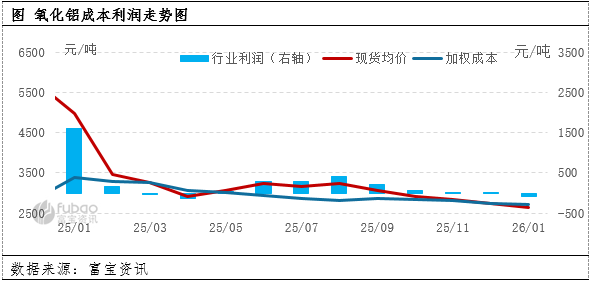 富宝资讯数据监测,2026年1月国内氧化铝加权生产成本2727.94元/吨,较上月降16.16元/吨,降幅0.59%;利润均值为-89.56元/吨,较上月减少91.66元/吨,降幅4364.76%。氧化铝生产成本松动,主要在于铝土矿、动力煤、烧碱等原料价格下跌;利润方面,氧化铝企业利润处于亏损,主要在于现货供应依然充足,现货价格下跌。