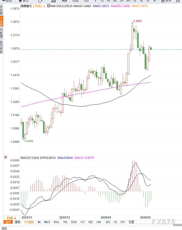 动能指标方面,短周期震荡指标自高位回落,但尚未进入极端超卖区间,意味着下行空间仍有释放可能。若汇价持续承压,1.3650一线将成为短线重要支撑区域;一旦有效跌破,或引发更深层次的技术性回撤。