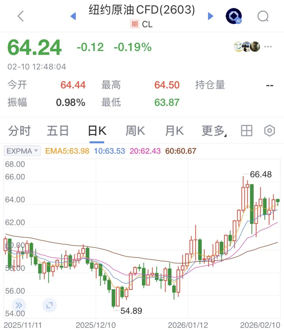 近期国际原油价格震荡上行,主要原因有以下几点:OPEC+八大核心成员国敲定3月继续暂停增产,叠加哈萨克斯坦产量下滑、美国冬季风暴引发的短期供应扰动,再加上美国原油库存超预期大幅去库形成供应端支撑。此外,中东地缘局势紧张,美国对伊朗实施新一轮制裁压制其原油出口推升地缘风险溢价,阶段性美元走弱也降低了原油国际采购成本、提振交易需求。