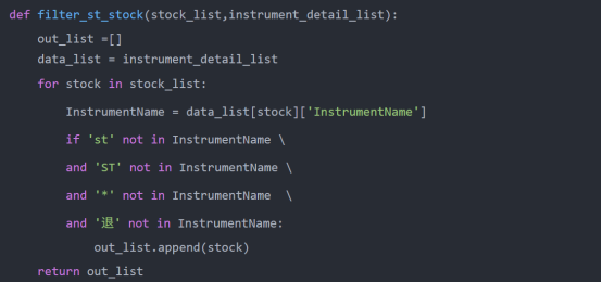 4、过滤ST股票这里在接口文档没有找到可以直接获取ST股票列表的接口,所以直接根据股票名称来判断是不是ST股