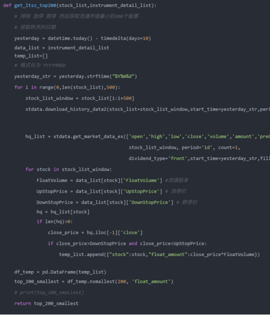 6、获取流通市值最小的200个股票这个方法里我同时过滤了涨跌停的股票