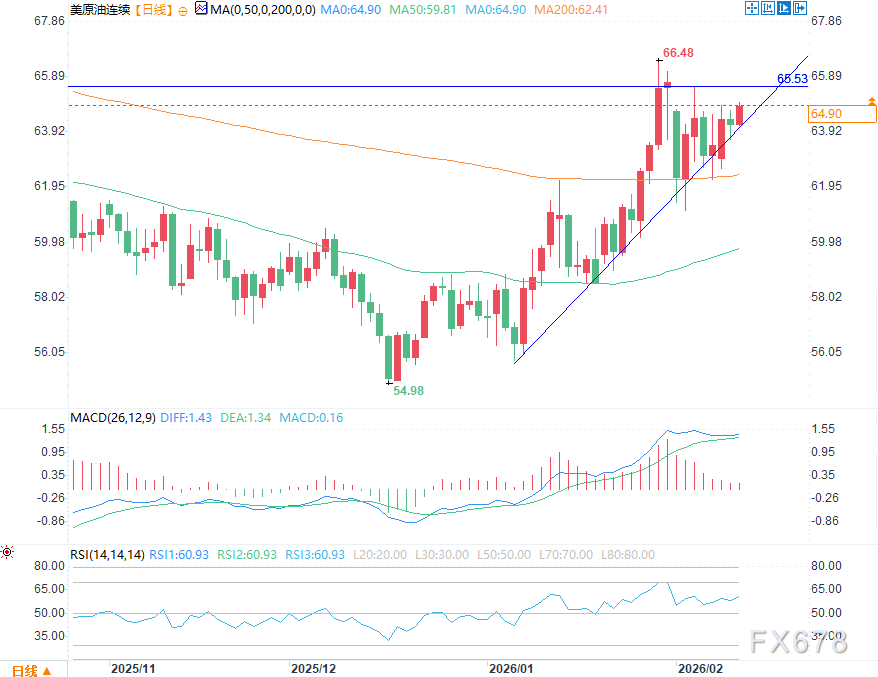 从技术面来看,结合摆动图表、趋势线以及移动均线等多项技术指标综合判断,当前3月WTI原油期货的主趋势仍为上行,整体走势较为稳健,上行动能虽有所放缓,但并未出现明显的走弱信号。