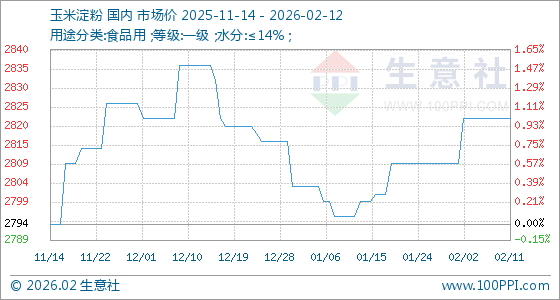 2月12日生意社玉米淀粉基准价为2822.00元/吨