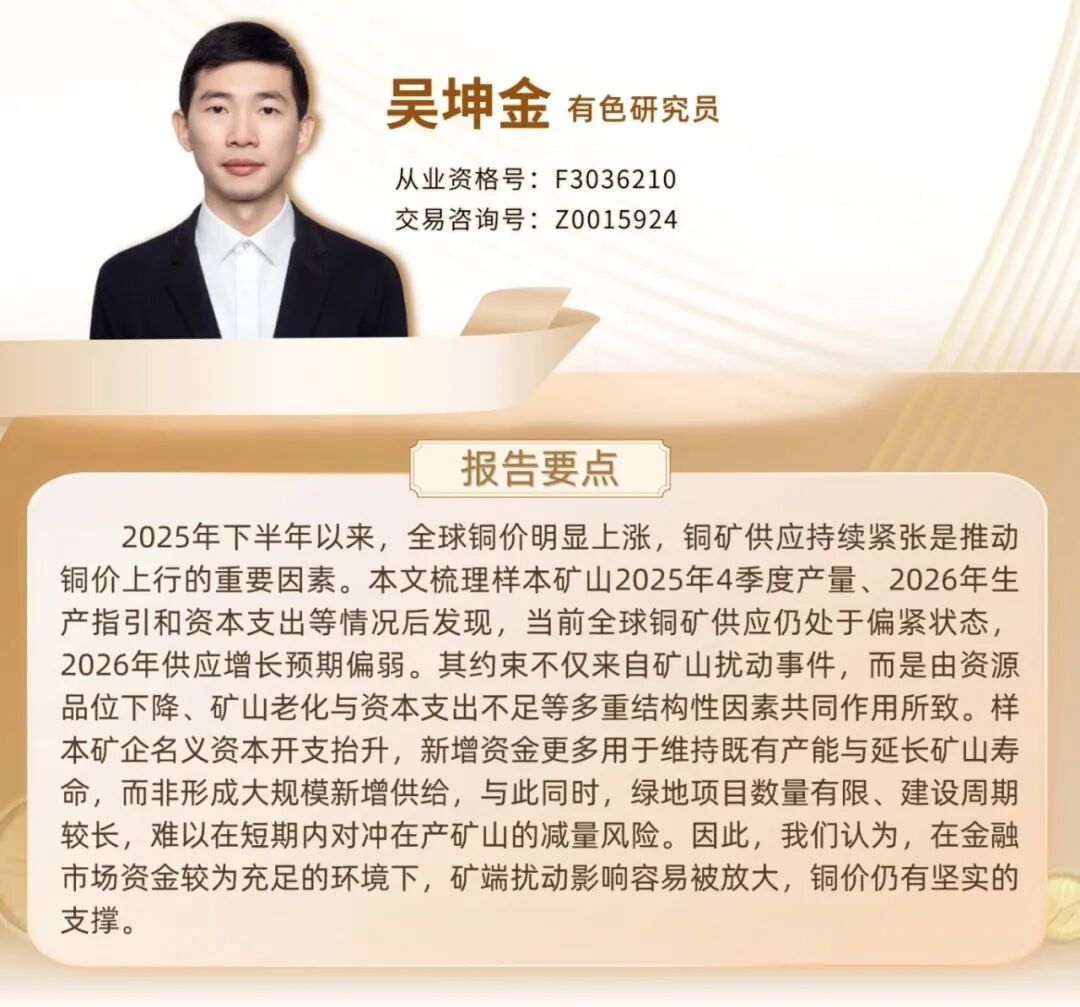 2025年下半年以来,全球铜价明显上涨,铜矿供应持续紧张是推动铜价上行的重要因素。本文通过梳理样本矿山产量2025年4季度产量、2026年生产指引和资本支出等情况,以对未来的铜矿供应格局有更清晰的判断。
