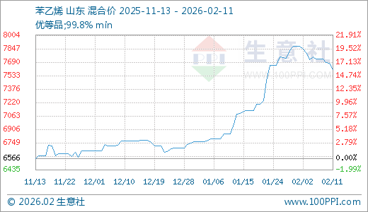 02月11日苯乙烯7608.00元/吨60天上涨12.38%