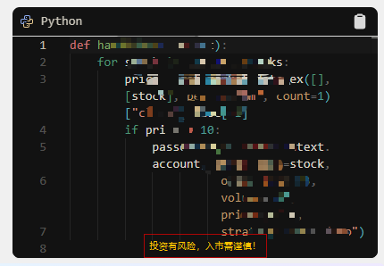 禁止使用 time.sleep()、死循环、加锁等操作,否则会导致所有策略卡死;