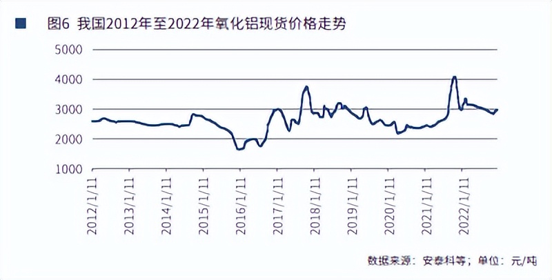 2021年至2022年,受大宗商品整体高波动的影响,氧化铝价格再次冲高回 落。2021年以来,在国内电解铝价格高位运行、烧碱以及煤炭等原料成本高企的 影响下,氧化铝价格重回3000元/吨以上,直至11月初,氧化铝价格创下历史纪 录高位4094元/吨。此后,2021年底至2022年,因氧化铝供给整体过剩,价格重 心再度回落。截至2022年底,氧化铝价格跌至2981元/吨,较当年2月下旬的高点 下跌12.8%。