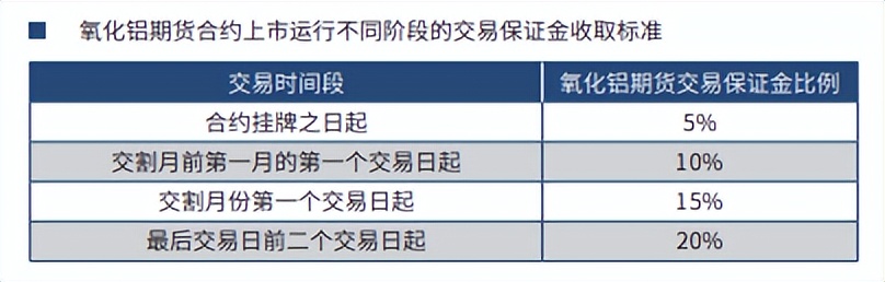 2、交易所根据氧化铝某一期货合约上市运行的不同阶段(即:从该合约新 上市挂牌之日起至最后交易日止)制定不同的交易保证金收取标准。具体规定如 下: