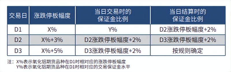 5、当某氧化铝期货合约连续三个交易日(即D1、D2、D3交易日)的累计涨 跌幅(N)达到7.5%; 或连续四个交易日(即D1、D2、D3、D4交易日)的累计涨 跌幅(N)达到9%; 或连续五个交易日(即D1、D2、D3、D4、D5 交易日)的累 计涨跌幅(N)达到10.5%时,交易所可以根据市场情况,采取单边或双边、同 比例或不同比例、部分会员或全部会员提高交易保证金,限制部分会员或全部会 员出金,暂停部分会员或全部会员开新仓,调整涨跌停板幅度,限期平仓,强行 平仓等措施中的一种或多种措施,但调整后的涨跌停板幅度不超过20%。