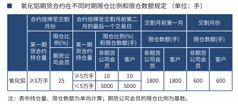 4、期货公司会员、非期货公司会员和客户的氧化铝期货合约在不同时期的 限仓比例和限仓数额具体规定如下: