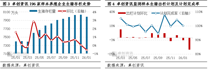 卓创资讯监测196家样本养殖企业1月生猪存栏量环比微减。一方面,生猪存栏与4个月前的能繁母猪变化相对应,而此前能繁母猪存栏已处于下滑态势,源头产能的缩减,为1月生猪存栏回落奠定了核心基础。另一方面,卓创资讯监测227家样本养殖企业数据显示,1月生猪出栏计划完成率为100.06%,养殖端整体小幅超额完成出栏计划,进一步推动生猪存栏量下降。不过受区域流通、场内生猪适宰情况及出栏安排等因素影响,国内部分区域养殖端1月份出栏计划执行不及预期,相应出栏量被迫延迟至2月份,这在一定程度上对冲了存栏下滑的幅度,使得 1月生猪存栏减量未进一步扩大。