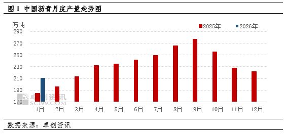 进入2月份,除南方地区部分项目仍有收尾工作以外,其他大部分地区道路市场需求基本结束,防水企业也陆续停工放假,2月沥青刚性需求将是一年之中最弱的时期。此外,随着春节假期临近,汽运物流行业也将逐渐停运,汽运运力紧张不利于沥青资源移库。因此,主力炼厂为避免假期前后出货压力,或提前降低沥青排产,这将导致2月沥青产量延续下滑走势,预计2月沥青产量将降至180-185万吨,为2026年月度产量最低值。