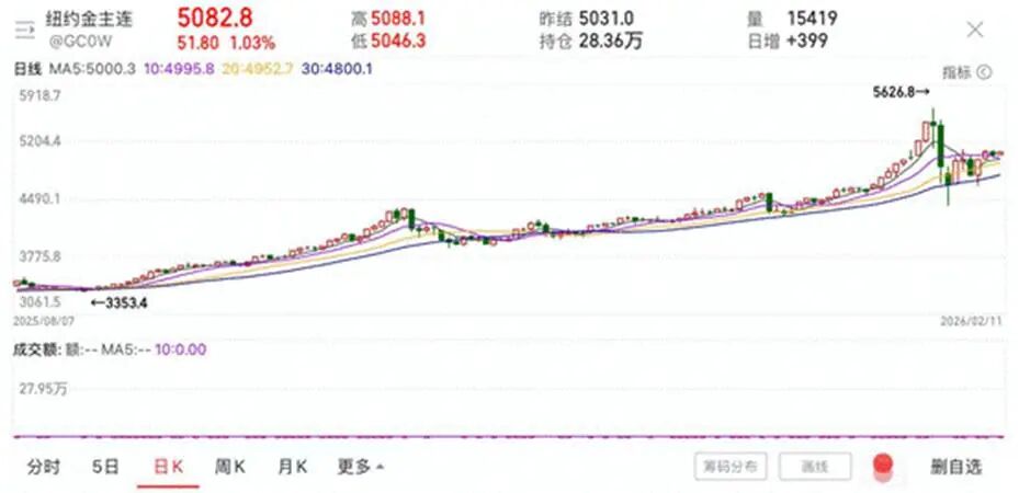 回顾国际金价今年的走势,首先是在1月底金价飙升至5600美元/盎司以上,但在创下历史新高后,金价又上演了“高台跳水”。目前,国际金价已经重返5000美元。白银市场同样走出“过山车”行情,单日超25%的跌幅令人记忆犹新。