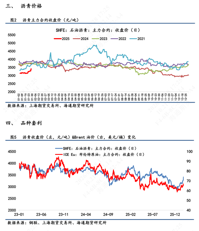 另外可以看到,资金在1月27日拉涨03近月合约后,逐渐在拉涨06合约,日内涨幅3.49%,高于03涨幅3.39%。远月未被打入的涨价预期得到体现。短期来看,沥青绝对价格走势依旧取决于成本端,成本端当下被注入了地缘、寒潮、哈萨克斯坦供应扰动等多重利好因子,油价短期表现偏强预期或推动沥青跟随偏强。尚且留意地缘是否出现缓和迹象。谨慎追高,把控好仓位。