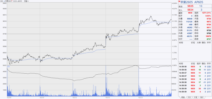 当周(2026年2月9日-2月13日),AP2605合约价格连续上涨,周内累计涨幅达3.14%。