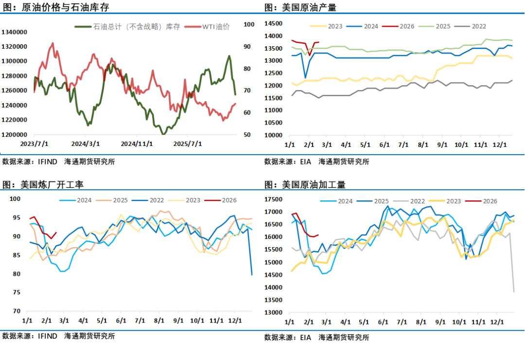 第二件就是直接牵动油价的美国与伊朗之间就谈判和军事冲突之间的博弈,围绕伊朗的种种动向引人关注。美国不断在伊朗周边“重兵集结”,美对伊军事打击“一触即发”之际,阿曼外交大臣2月22日宣布新一轮美伊谈判定于26日在瑞士日内瓦举行。在谈判继续的同时,美国持续通过军事施压以迫使伊朗让步,截至2月20日,美军在中东部署“林肯号”和“福特号”双航母战斗群,总兵力超万人,并集结包括F-22、F-35等数十架战斗机及预警机、加油机等空中力量。这是自2003年伊拉克战争以来美军在中东最大规模的空中力量集结,可支撑持续数周的空袭行动。面对美国持续施压,伊朗方面被迫进行备战,伊朗革命卫队近期在霍尔木兹海峡举行军演,强调“迅速应对海上威胁”。2月17日,伊美第二轮核谈判在日内瓦举行,伊朗提出愿在解除制裁前提下讨论核问题让步,但坚持“导弹能力不容谈判”的红线。伊朗称“比航母更危险的是击沉航母的武器”,强调遭袭将反击中东所有敌对目标。分析指出,美伊矛盾已从核问题转向战略对峙,美国意图通过军事施压迫使伊朗让步,但伊朗导弹库存及地区盟友反制能力仍是美以顾虑。特朗普2月19日称,将在“未来10天内”决定是否对伊动武,并警告若伊朗拒绝协议,打击将比2025年“更猛烈”。美方匿名官员透露,军事行动可能包括摧毁核设施残余及政权更迭目标。美国官员表示,目前的外交努力可能是特朗普总统在发动大规模美以联合军事行动(可能直接针对伊朗最高领袖哈梅内伊)之前给予伊朗的最后机会。从时间表来看,美国对伊朗是否采取军事行动的谜底或许会在进行了近2个月的炒作后迎来揭晓谜底时刻。而这个过程几次军事行动风险的升级已经推动了油价走出了2年来的最佳年度开局,地缘风险给原油带来了10美元左右的风险溢价,也进一步影响到了资金对油价的预期。从去年年底的悲观预期中不断改善回暖。典型体现是地缘炒作这段时间专业机构的持仓迅速从空头转向增持净多头寸。最终如果美伊之间爆发冲突危及霍尔木兹海峡石油运输的局面,从当前市场情绪及预期来看,可能会推动油价冲向90美元甚至更高目标。如果伊朗最终妥协让步,军事风险降温,市场则会迅速下调预期。