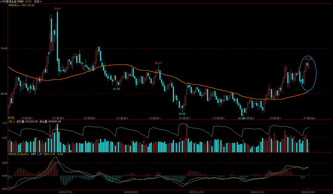 整个春节假期,原油市场6个交易日的表现整体呈现了易涨难跌的局面,有谈判消息油价就小幅回落,出现军事风险升级油价就大幅冲高,市场情绪有摇摆,但最终春节假期油价上涨明显,意味着市场认为美伊之间发生军事冲突的概率较高,油价可能继续冲高。就像白宫发言人表示的美伊谈判取得进展,但关键议题仍存巨大分歧。油价在进入2026年之后的运行节奏就完全围绕美伊博弈展开,从该事件进展来看,在从年初到现在经历了近2个月的发酵后,当地时间2月26日本周四在瑞士日内瓦举行的这轮美伊谈判将是一个非常关键的时间节点。油价很可能在接下来的时间内迎来超级波动阶段,考虑到地缘事件不确定性的巨大风险,注意强化风险控制,谨慎参与市场。