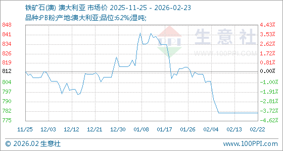 2月23日生意社铁矿石(澳)基准价为781.44元/吨